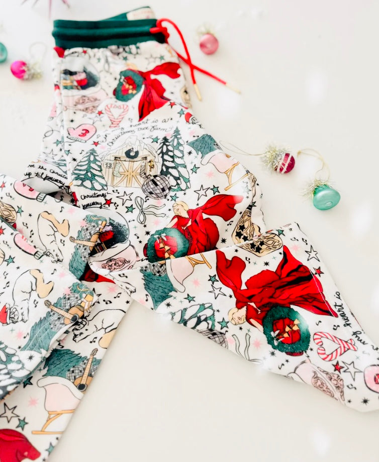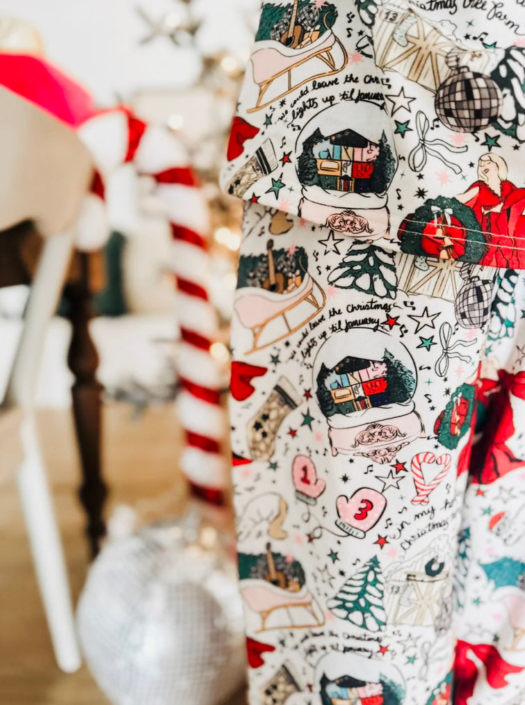 Cozy soft french terry lounge sets are here for the holidays! This 2pc set has long sleeves with a wide leg pant with an adjustable drawstring waist. Printed on a white background with dark green trim and red drawstring. So cozy for holiday gatherings and Christmas lights drives! Dress these up or wear casually, designed with both in mind!