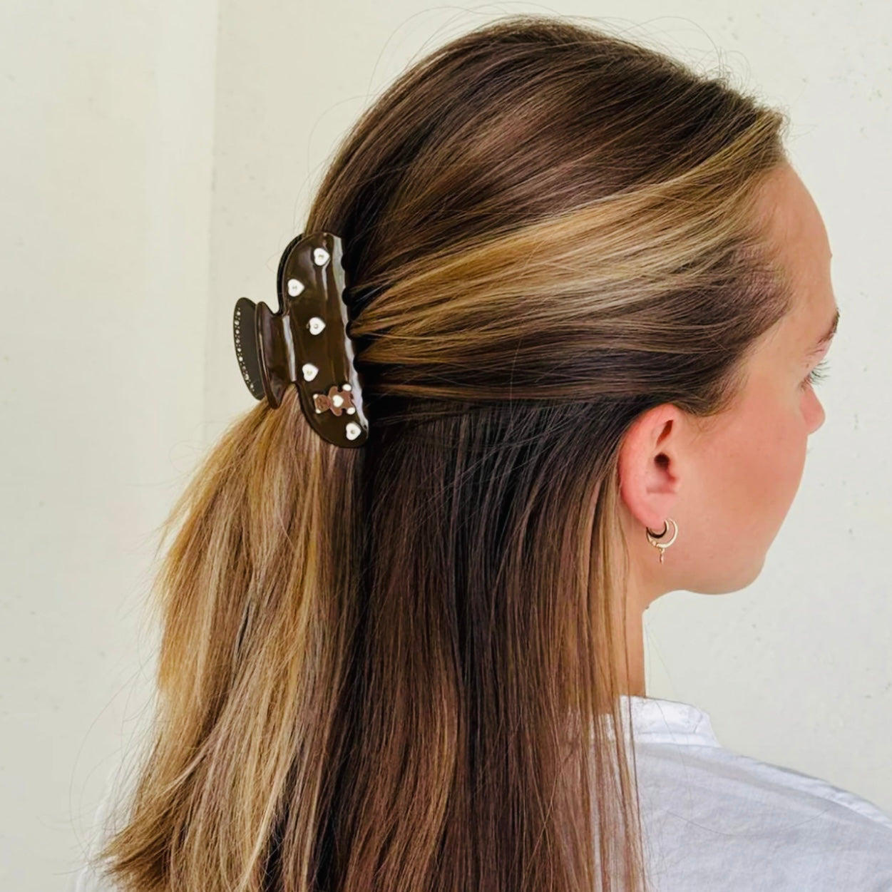 Sweet as can be, this clip is made with beautiful tiny stones and cellulose acetate. Designed with love and ultra-femininity in mind, Emi Jay’s Sweetheart claw clip will hold your hair from morning until night. Perfect for a low bun or half-up-half-down look.