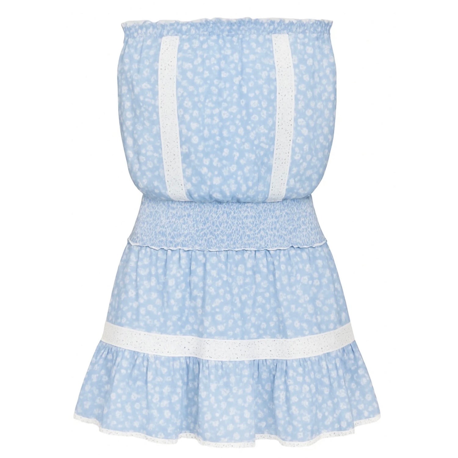 The Lucia Lace Insert Day Dress is a sweet, easy silhouette designed for warm days. Featuring a soft blue floral print with delicate lace inserts, this strapless style is finished with a smocked waist and a tiered skirt for a feminine, flattering look.